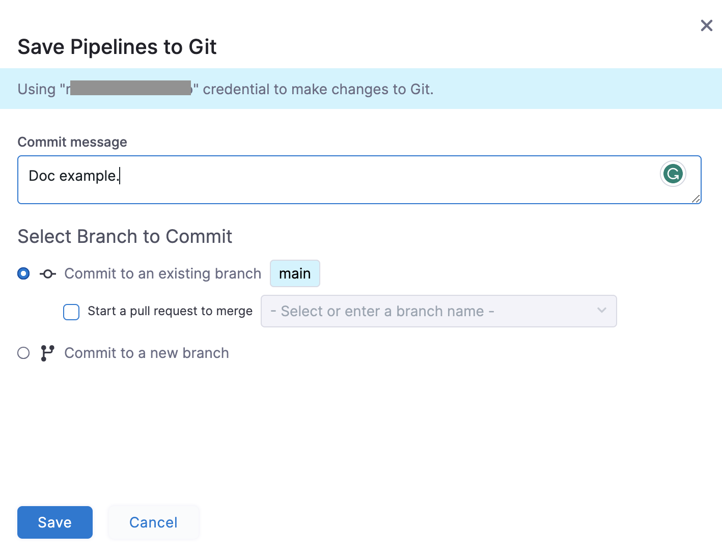 Edit the pipeline and select Save. The Save Pipelines to Git settings appear. Harness displays the user name being used for this commit.