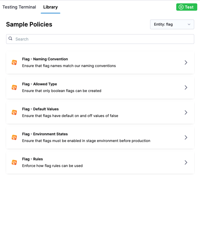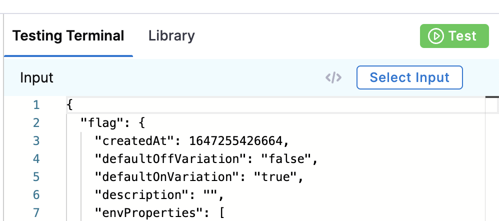 You can only test a policy in the Testing Terminal if you have previously run a Policy Evaluation. If you are creating your first ever policy for the Project, continue to Step 2: Add the Policy to a Policy Set. After you have applied your first policy to a Feature Flag, you can then use the Testing Terminal.
