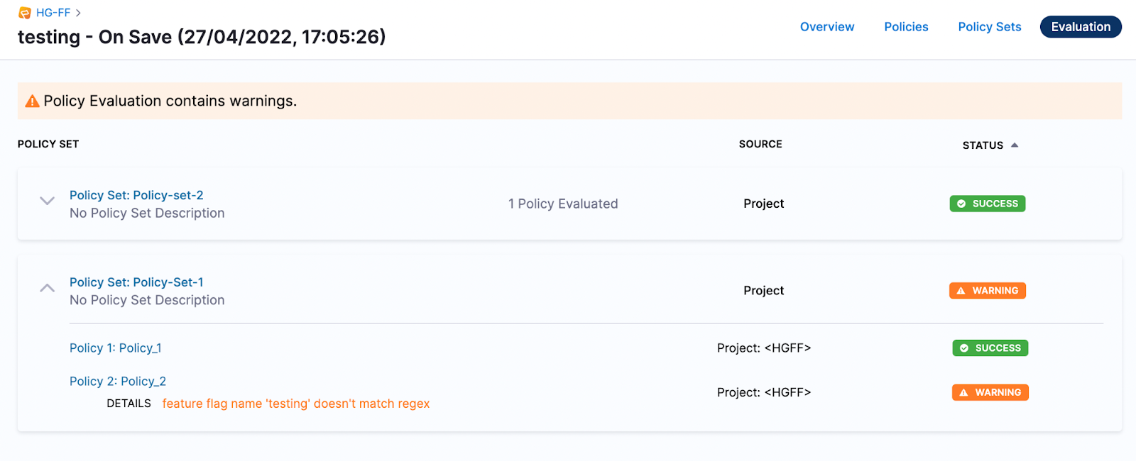 You can view all failures, warnings, and successes of evaluations for each of your Policy Sets.