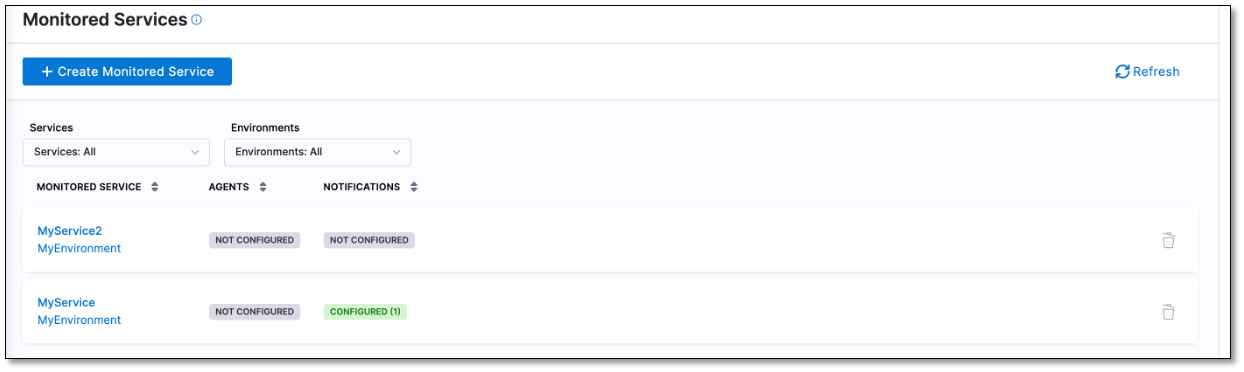 Select Save. The monitored service is created and appears in the list of existing monitored services.