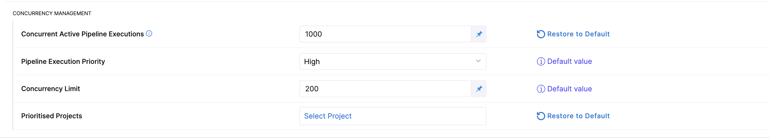 This is the number of concurrent pipeline executions allowed per execution API request. The setting considers only those executions that are in progress (including those that are paused temporarily by steps such as the wait step or approval step), not those that have executed to completion. Users are permitted 200 and 500 Concurrent Pipeline Executions (based on your plan) across the entire account by default. You can increase it to 500 and 1000 Concurrent Pipeline Executions (based on your plan).
