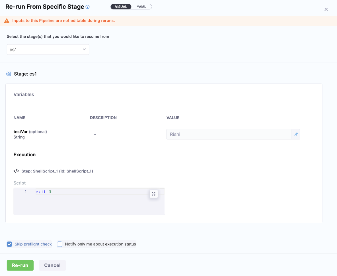 You will see a banner at top Inputs to this Pipeline are not editable during reruns., which states that you won't be able to change the inputs for this pipeline.