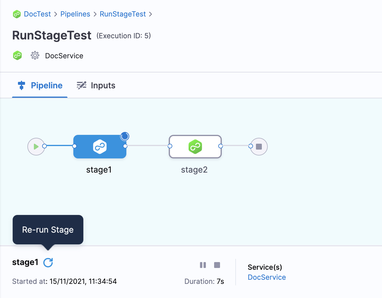 When viewing execution details for a previous pipeline run, you can select Re-run or Re-run Stage to rerun a single stage. If necessary, you're prompted to provide runtime inputs.