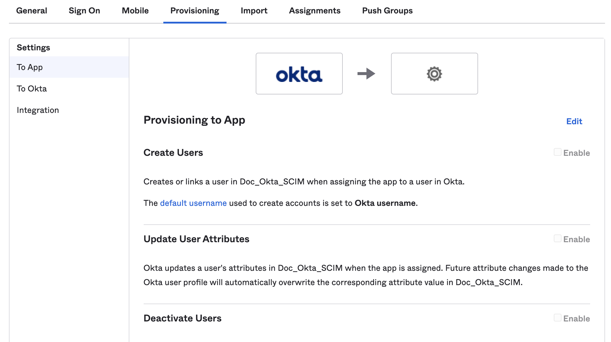 10. Go to the Provisioning tab, and select the To App settings.