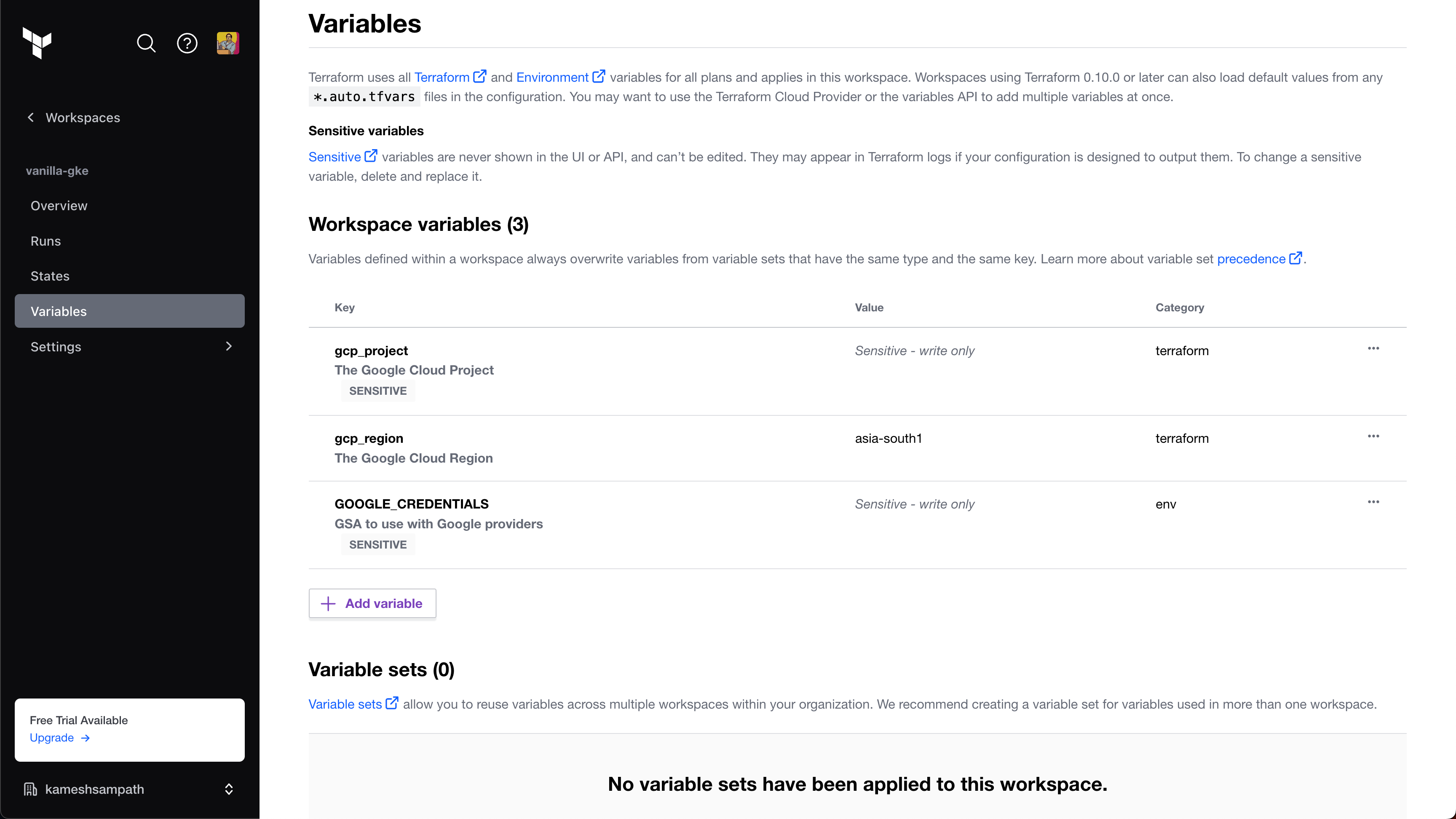 Key Value Category gcp_projectSensitive - write only terraform gcp_regionSelect a region terraform GOOGLE_CREDENTIALSSensitive - write only env