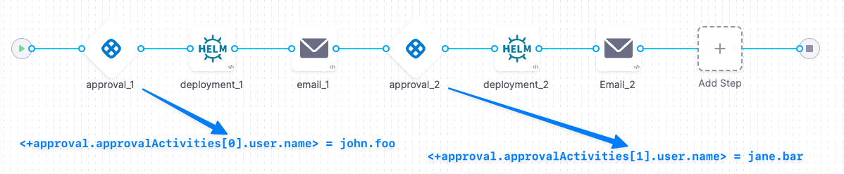 <+approval.approvalActivities[0].user.name>: The Harness username of the approver.<+approval.approvalActivities[0].user.email>: The email address of the approver.<+approval.approvalActivities[0].comments>: User comments from the approval, formatted as a single string. This variable is populated from thecommentoutput variable generated by the Approval step.
