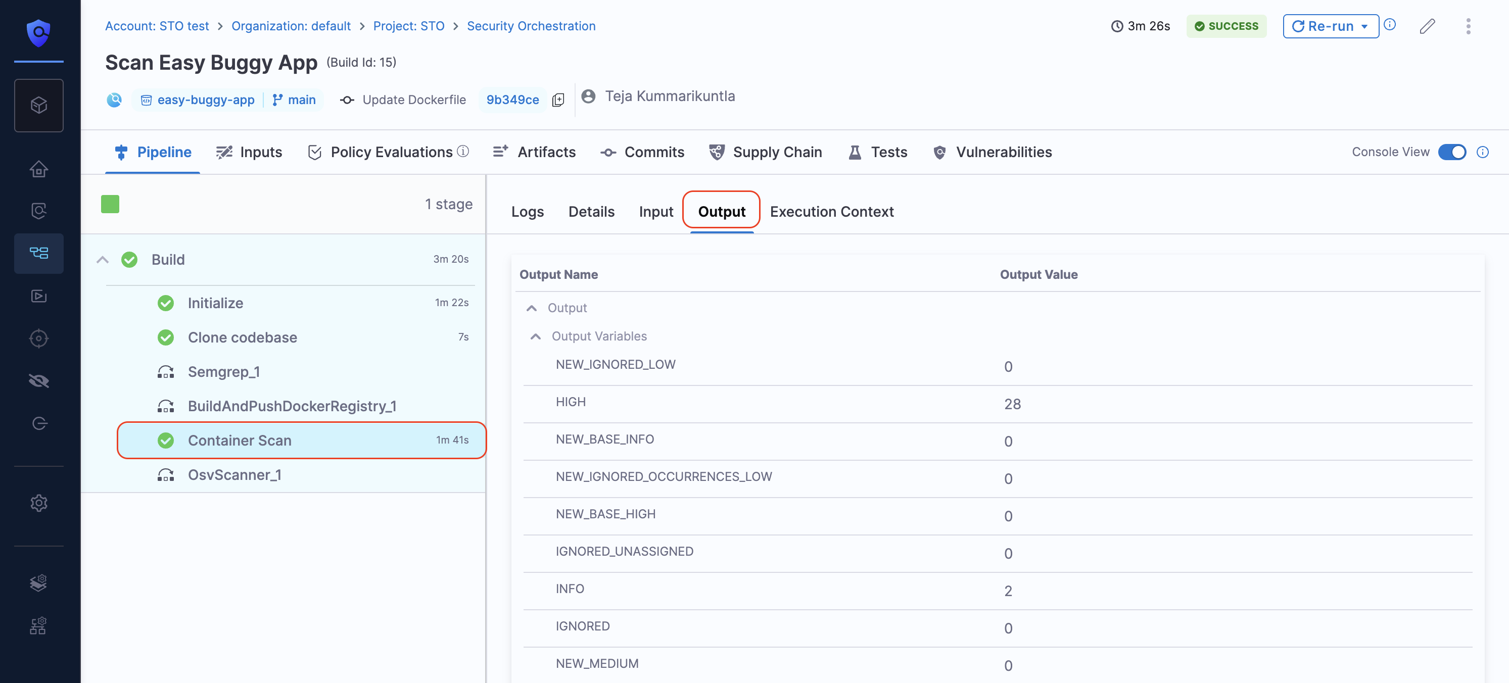 To view these output variables, navigate to the Output tab in your scanner step in the pipeline execution window.