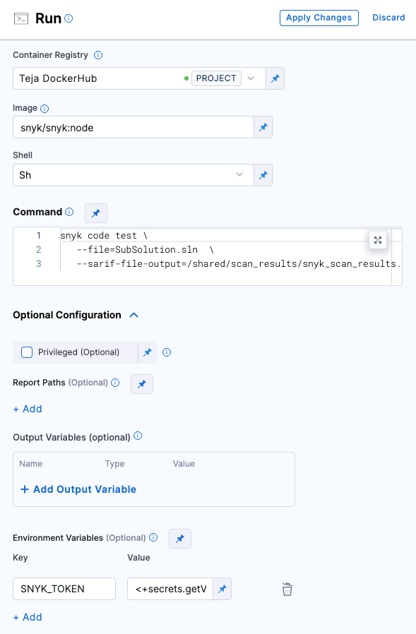 Refer to Snyk step configuration document to learn more about all the fields and their configurations.