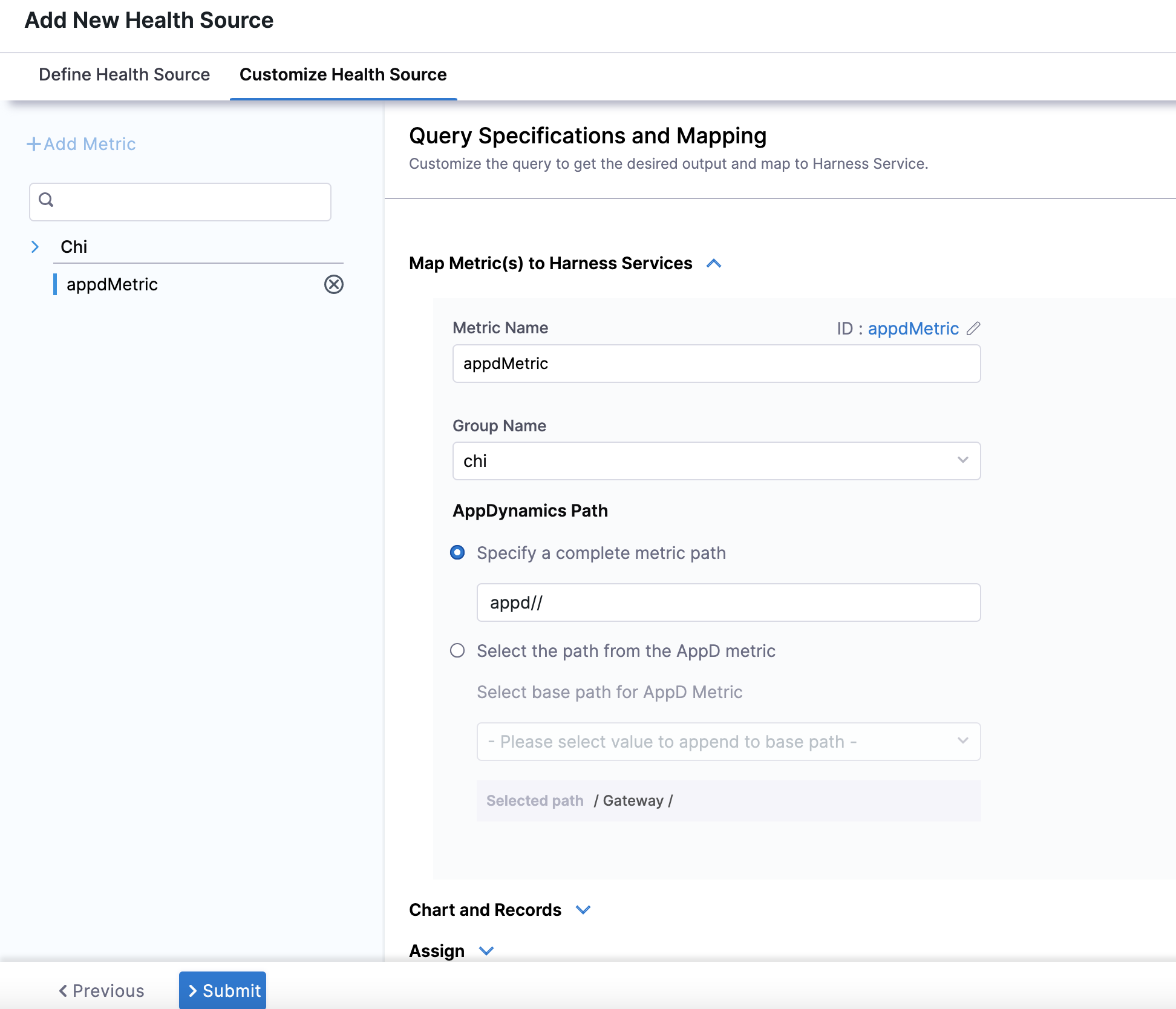 The subsequent settings in Customize Health Source depend on the Health Source Type you selected. You can customize the metrics to map the Harness Service to the monitored environment. In Applications & Tiers, enter the following details: