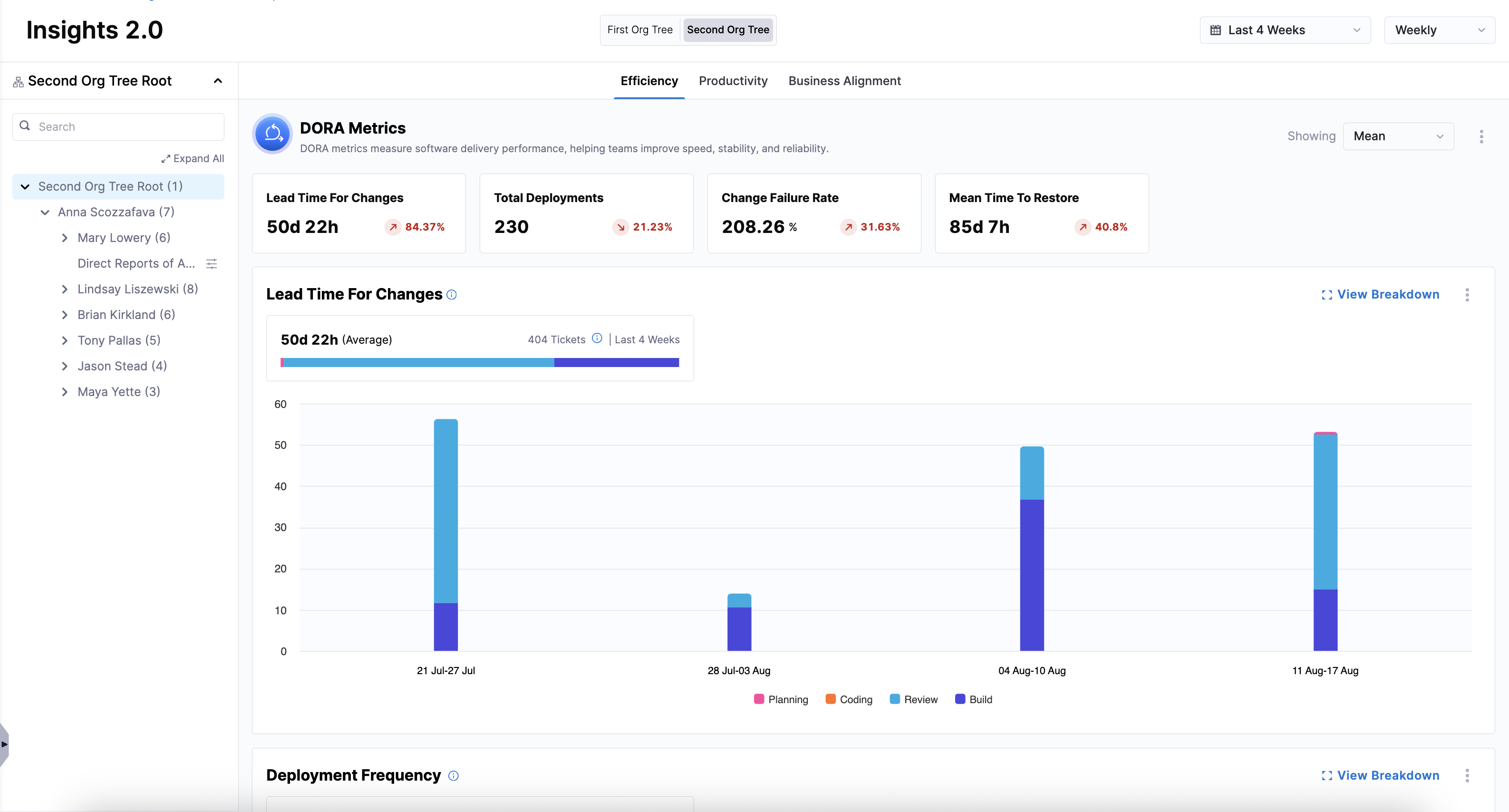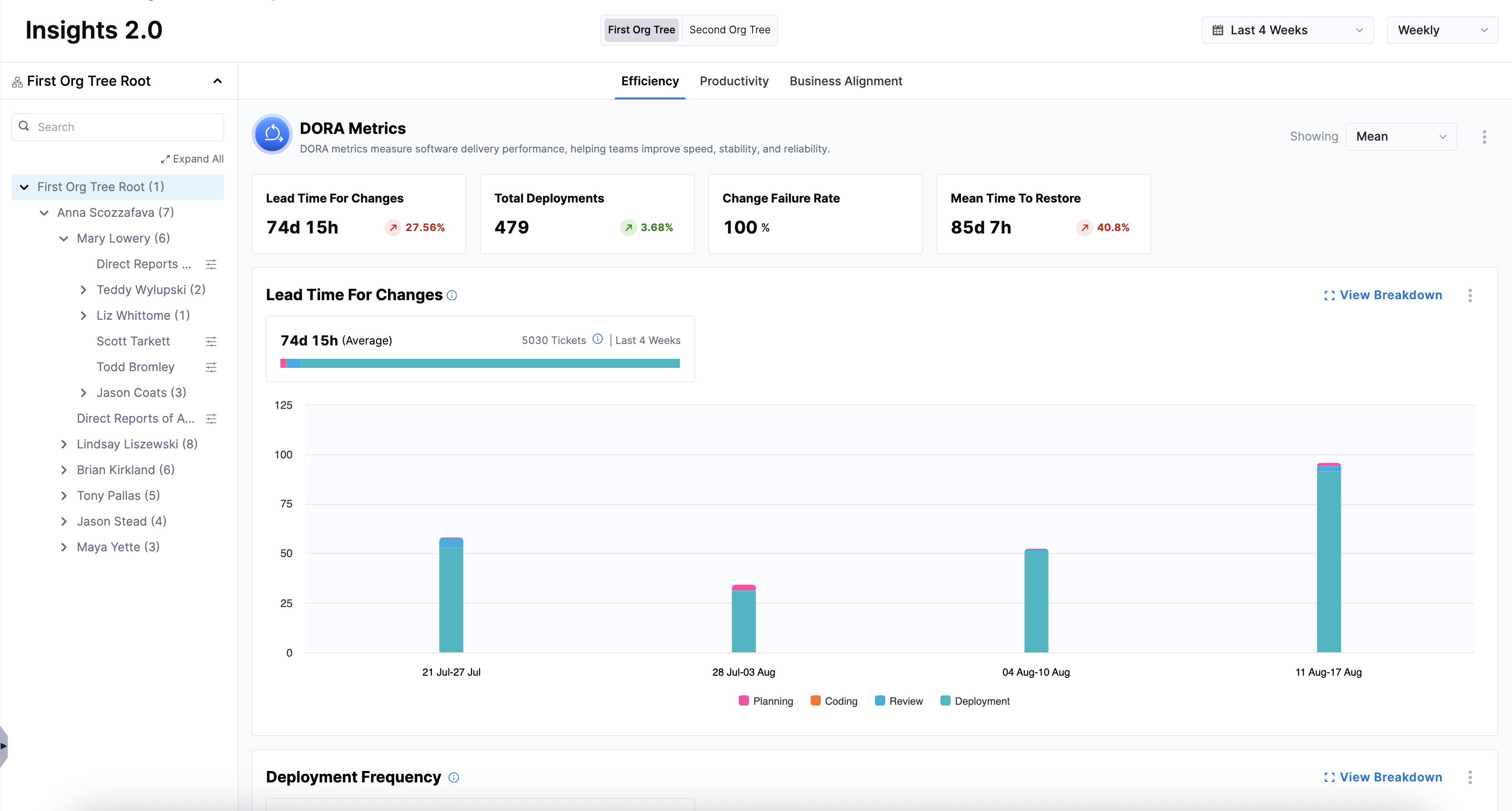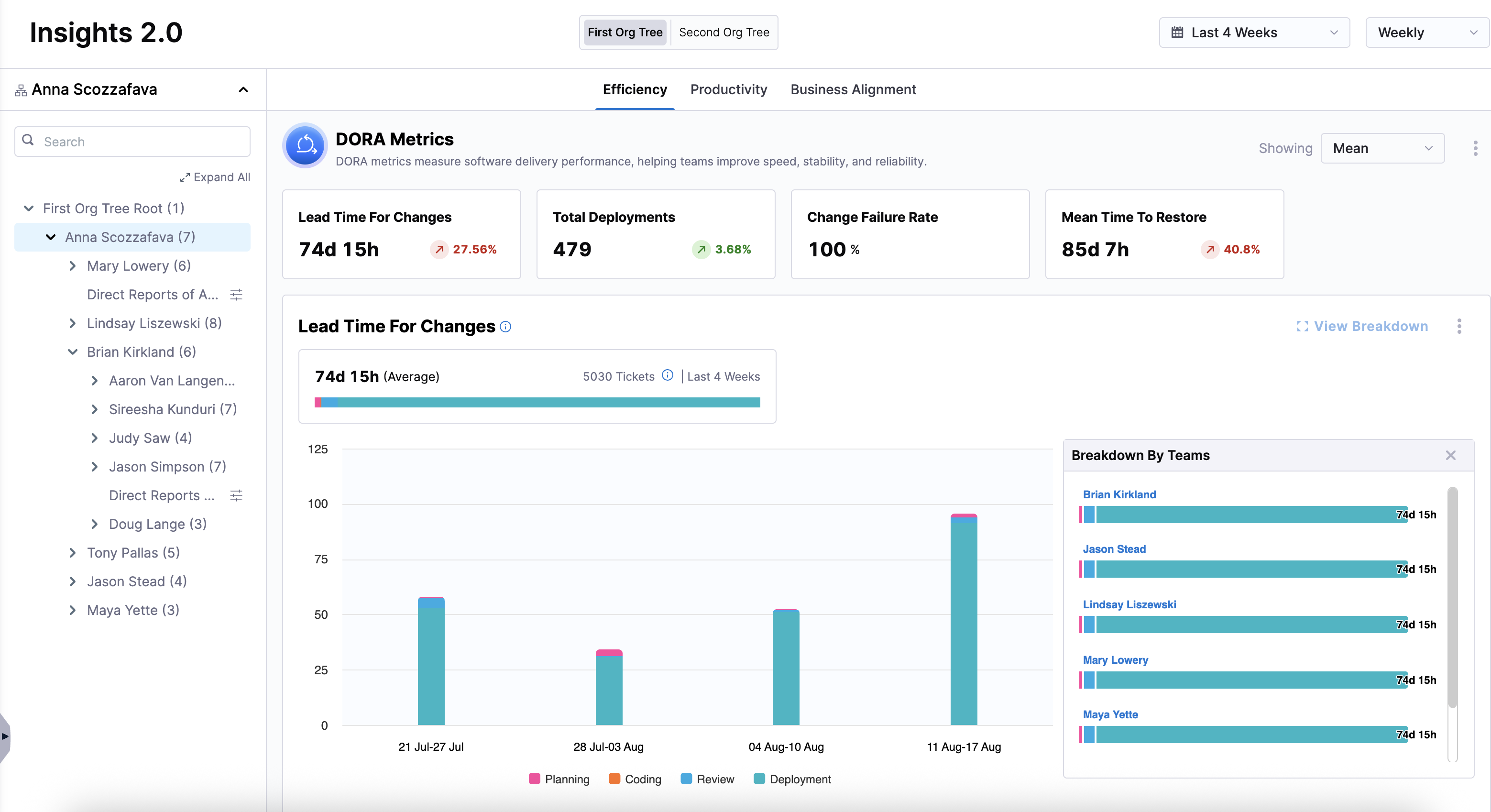 Once you've set up integrations, created profiles, uploaded your developer records, and created an Org Tree, you can view high-level insights such as Efficiency, Productivity, and Business Alignment for the entire organization.