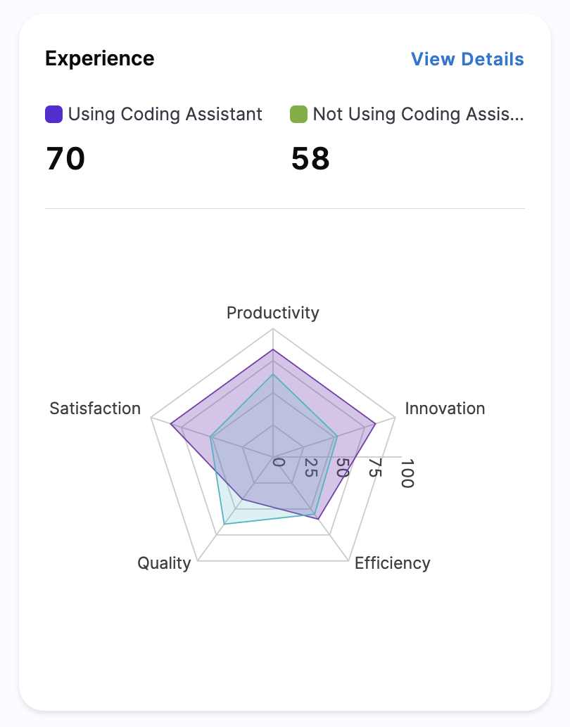 The Experience widget provides a side-by-side comparison of key developer experience metrics between teams using Coding Assistant vs. not using Coding Assistant. The categories are configured while setting up the report. The feedback received from the survey is visualized using a radar chart, allowing teams to analyze the distribution of feedback across experience categories. The data is derived by normalizing responses from developer experience surveys.
