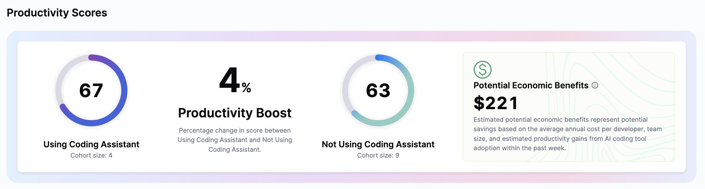 The Potential Economic Benefit represents the potential dollar amount saved by increasing developer productivity through AI tool adoption. It helps you estimate the economic benefits of rolling out AI code assistants across your entire organization based on productivity gains.
