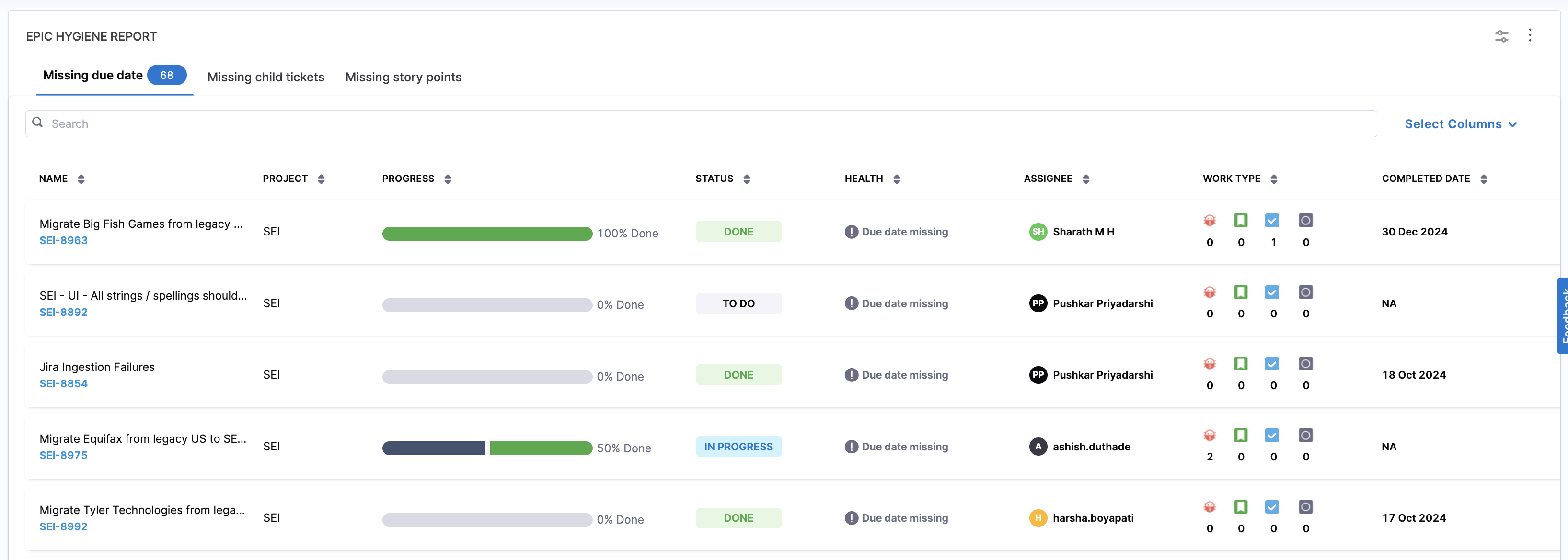The following Epic tracking widgets in Harness SEI help monitor epic health and track key projects: