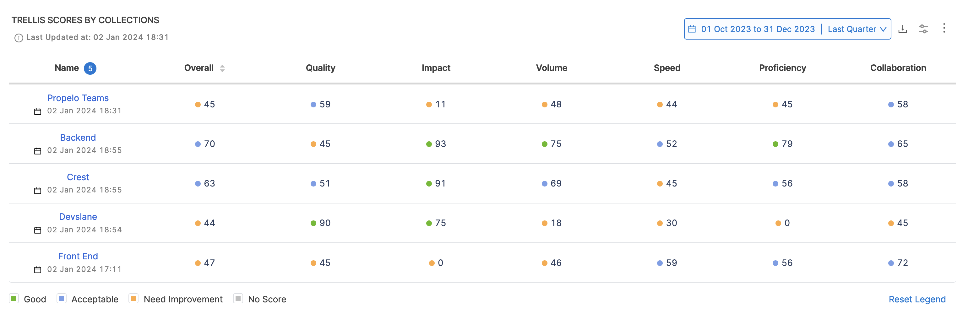 The Trellis Score Report calculates and displays the Trellis Scores by individual developers. The trellis score can be further divided into the following categories: