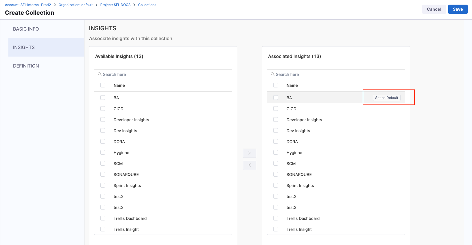 All Insights must be associated with at least one Collection. You can configure these associations through Collection settings or when creating or editing Insights. For information about creating and editing Insights, go to Insights.