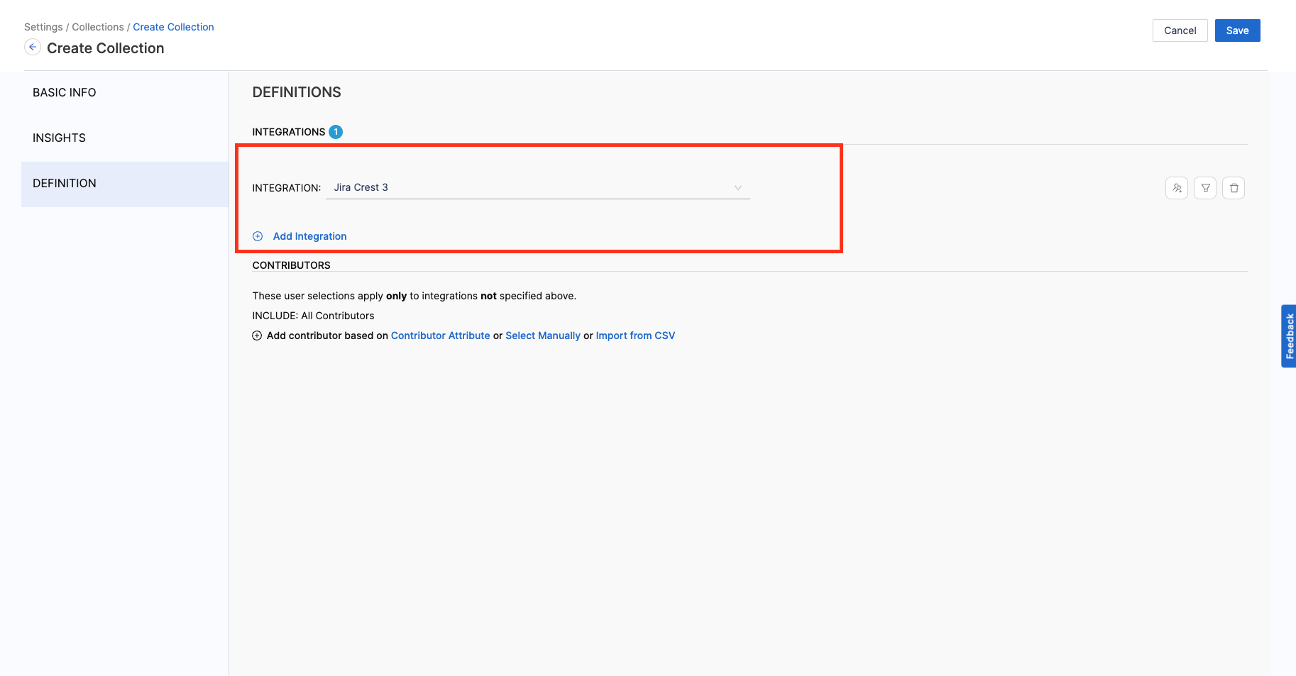 1. Use the Definition settings to define integrations associated with the Collection. By default, if you don't specify any integrations, the Collection automatically inherits integrations from the associated project.