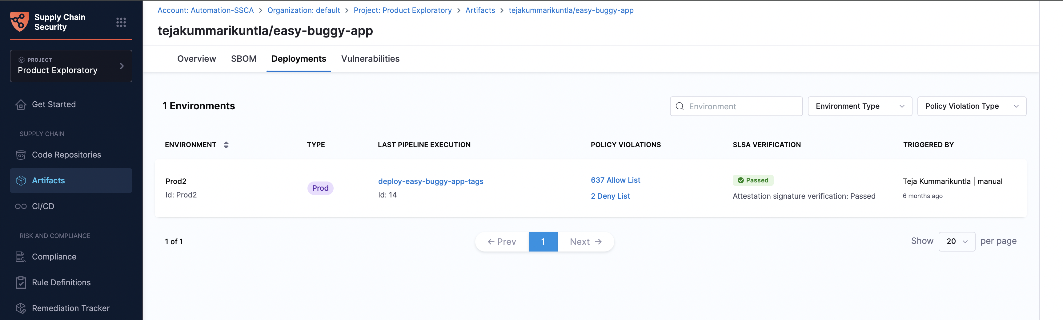 Any artifacts that go through SBOM Orchestration, SBOM Policy Enforcement, or SLSA Provenance will be listed here. Additionally, the Artifacts section integrates with the Harness CD (Continuous Deployment) and STO (Security Testing Orchestration) modules, providing details linked to deployments and security scanning results for images.