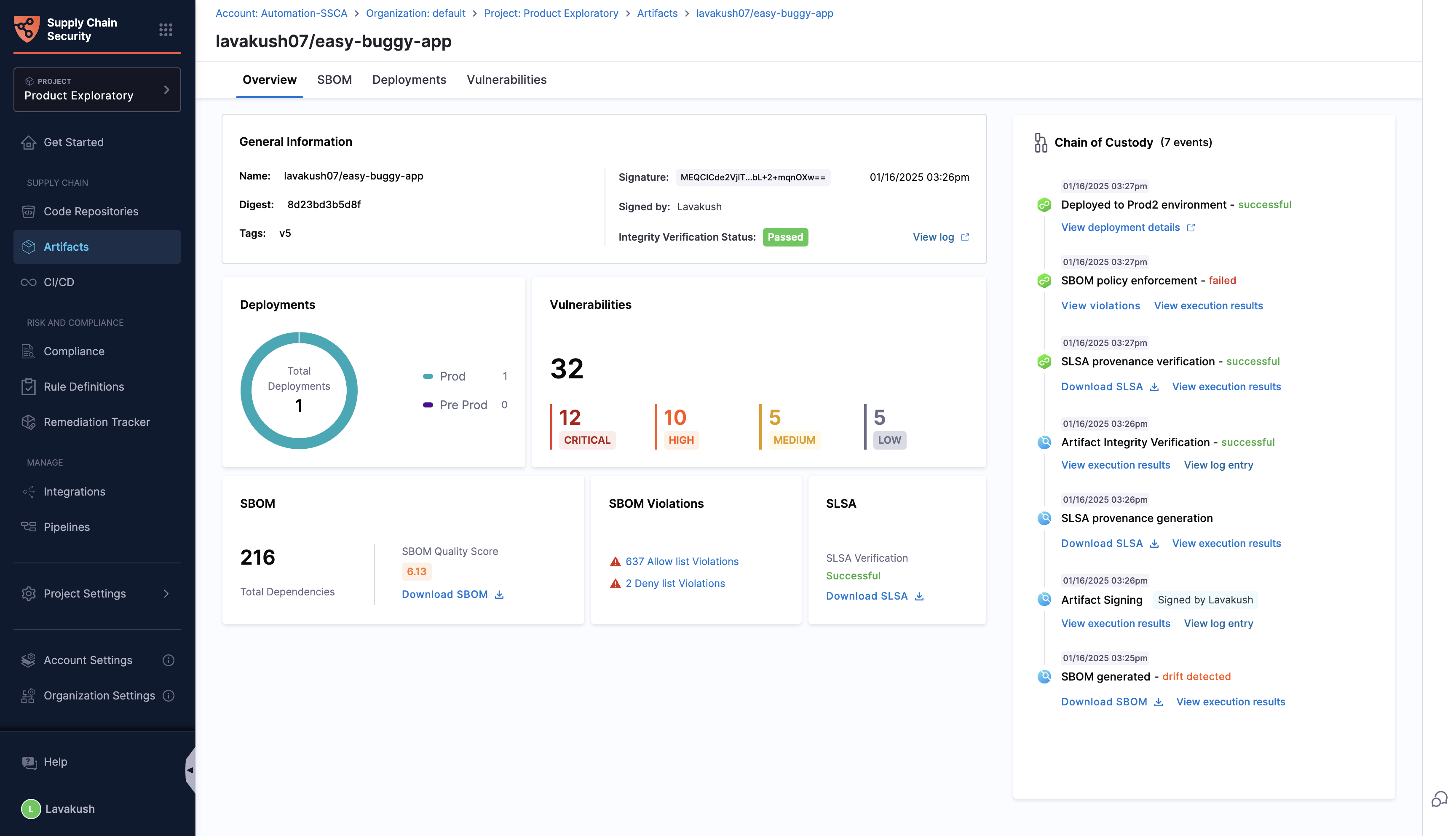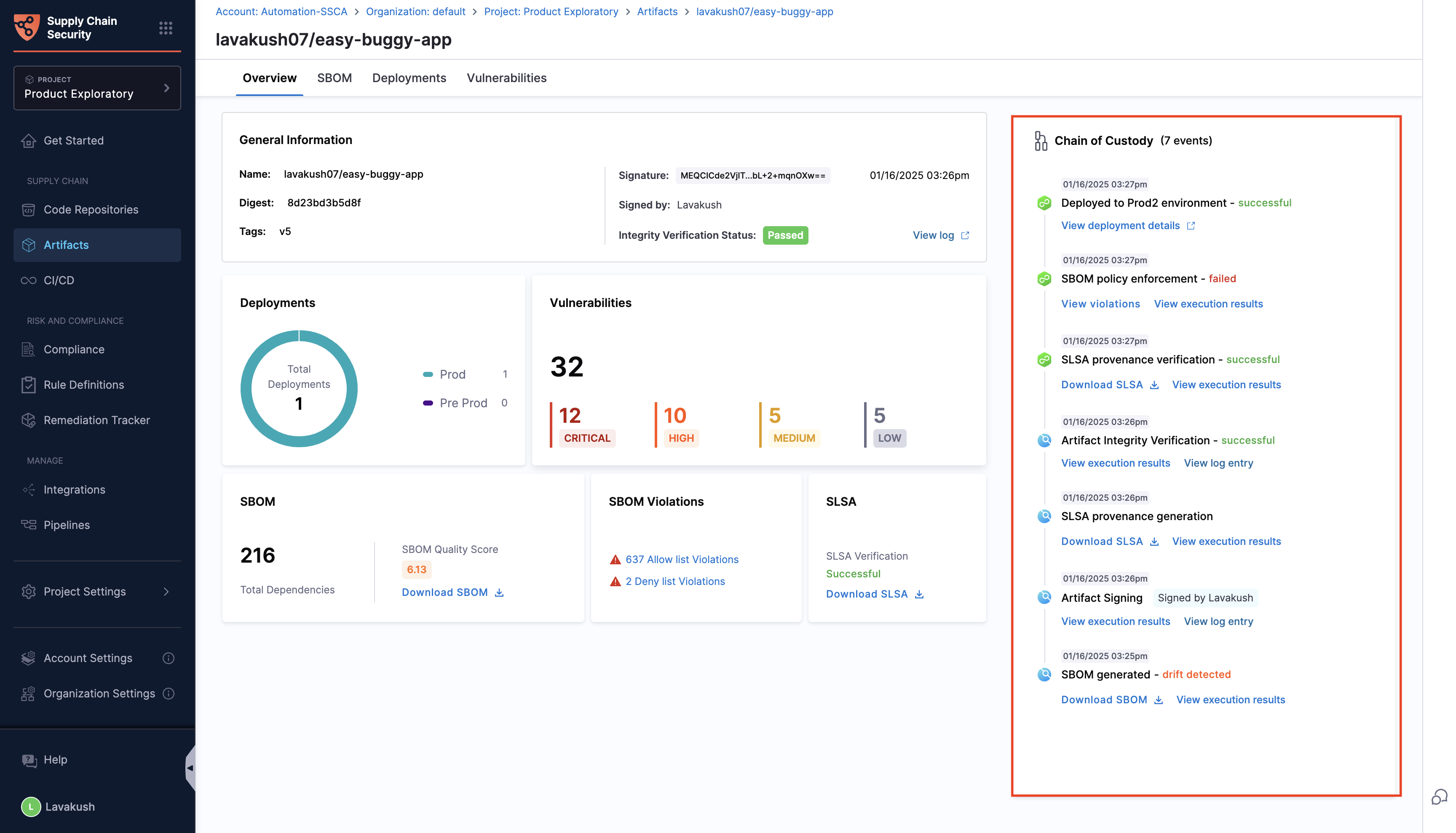 Each entry in the Chain of Custody contains relevant details about the artifact's progress, such as the status of the event, any associated downloadable artifacts, or a link to the pipeline execution results for further details. The information recorded varies depending on the specific event and includes: